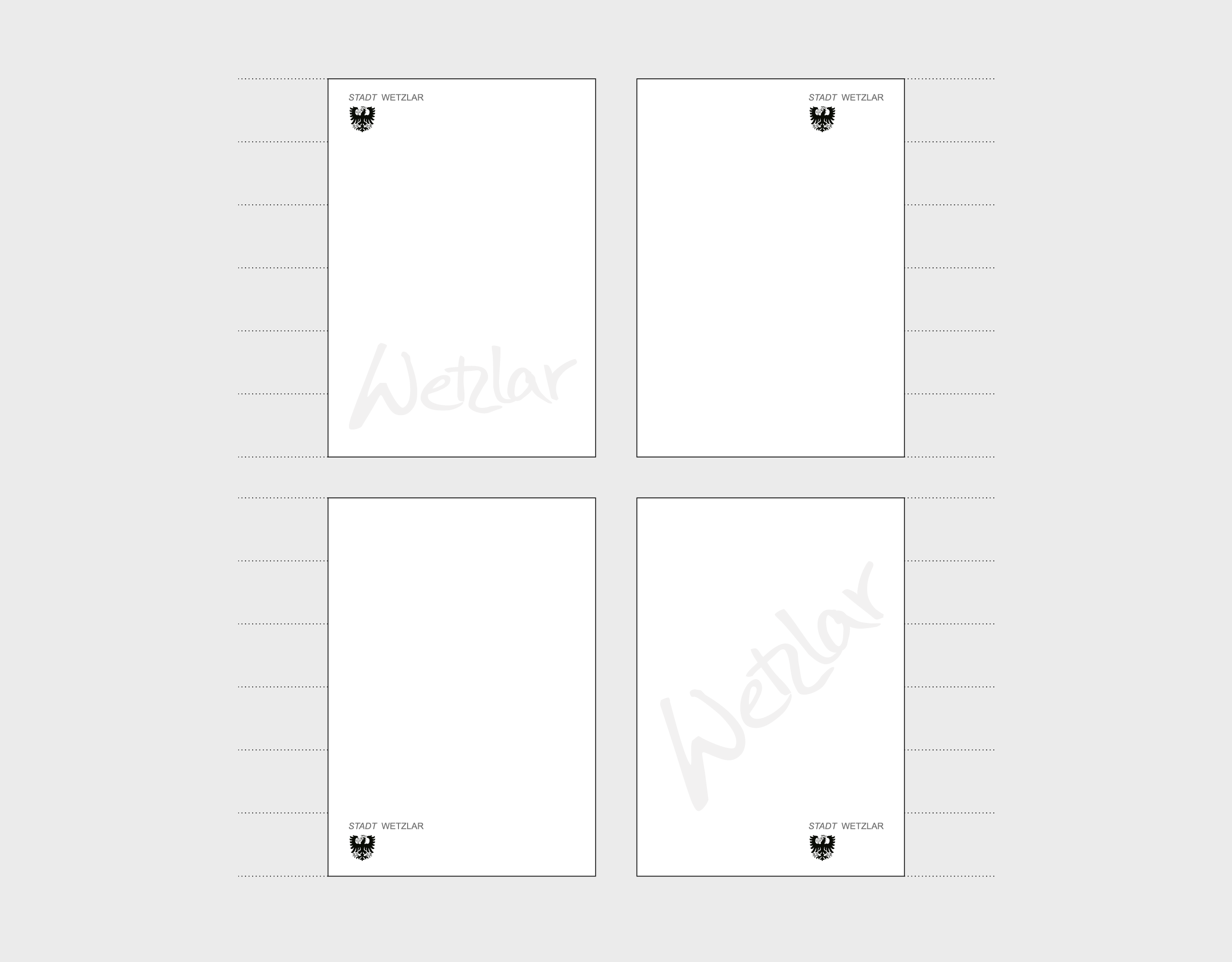 Die Position des Logos ist wie unten dargestellt möglich, Ränder und Abstände sind, wie auf Seite 8 beschrieben, zu übernehmen. Die oberen und unteren Sechstel der Seiten sollen möglichst frei von weiteren Gestaltungselementen bleiben. Als Ausnahme sind nur hinterlegte Stimmungsbilder (Moods) oder Farbflächen möglich, die die Erkennbarkeit des Logos nicht beeinträchtigen.